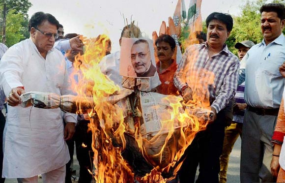 The Congress cadres took out a rally from their party office, shouting slogans against Giriraj Singh, garlanding his portrait with footwear and burning his effigies.