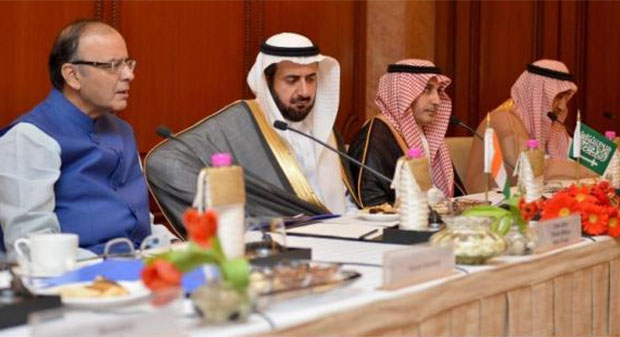 [Indian Finance Minister Arun Jaitley with Commerce and Industry Minister Saudi Arabia Tawfiq Al-Rabiah in a file photo.]