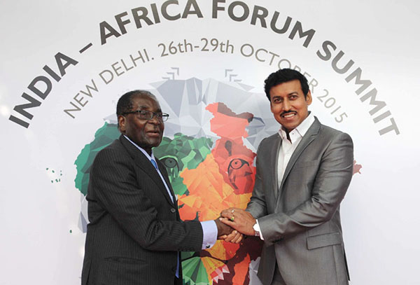[President of the Republic of Zimbabwe Robert Gabriel Mugabe being received by Minister of State for Information & Broadcasting Col. Rajyavardhan Singh Rathore, on his arrival, in New Delhi on October 27, 2015.]