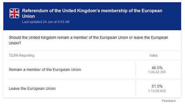 According to local media, a total of 266,721 people voted to leave the EU, while 259,790 voted to remain in the early morning, Xinhua news agency reported.