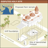 Meanwhile four court cases have been going on in the Allahabad High Court Lucknow bench, about the issue of title of the land, where Masjid was located. Of these four the arguments in three of the four Ayodhya title suit cases have been completed. The arguments for fourth case will be over by the month end (July 2010). While one is waiting the result of these court cases, RSS combine has already planned to build pressure for constructing Ram Temple, irrespective of the outcome of the court cases. The cases pertain to ownership of the land where the mosque was located. VHP etc. are asserting that no mosque will be permitted in Ayodhya. As per VHP, mosque has to be outside the ‘Shastriya Seema’ (Boundary) as given in the Ramcharita manas (The Ram Legend, by Tulsidas) of Ayodhay. Meaning there by that Ayodhya is a holy place of Hindus only. Meanwhile, BJP and other associates have been instructed to step up the demand for building Ram temple at the precise spot where they had demolished the mosque on 6th December 1992.