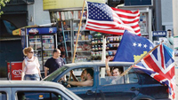 Kosovars wave US, Kosovo and British flags as they celebrate the World Court ruling in Pristina on Thursday.