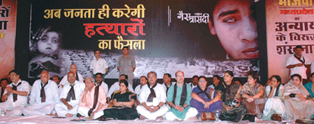 Speakers after speakers spewed ire against the trio demanding death to them and adequate compensation to the victims. BJP General Secretary in-charge of Madhya Pradesh Anant Kumar, BJP General Secretary and MP Narendra Singh Tomar and State president and MP Prabhat Jha amongst others addressed the sit-in demonstration.
