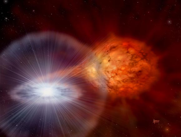[Artist's conception of a nova with a stream of matter being drawn from the donor star (right) to the compact white dwarf (left). David A. Hardy/astroart.org]