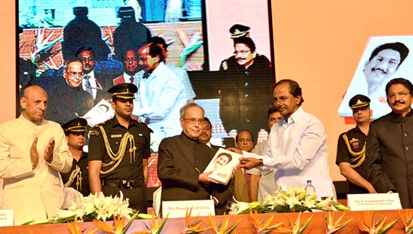 Telangana Chief Minister K. Chandrashekar Rao, who released the book, presented first copy to the president.