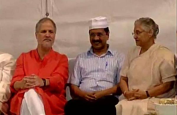 At one point, Kejriwal, wearing a skull cap, was flanked on one side by Jung, and on the other by Dikshit.
