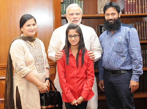 [Maryam Asif Siddiqui, winner of Bhagavad Gita Champion League, accompanied by her parents, Asif Naseem Siddiqui and Farhan Asif Siddiqui, meets Prime Minister Narendra Modi in New Delhi on June 18, 2015.]