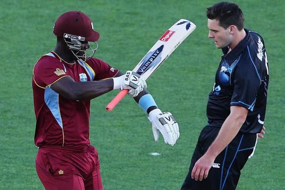 Their only 50-plus partnership was for the third wicket between Chris Gayle (61) and Marlon Samuels (27). The former smashed eight sixes and two boundaries in his 33-ball knock before being bowled by Adam Milne (1-42).