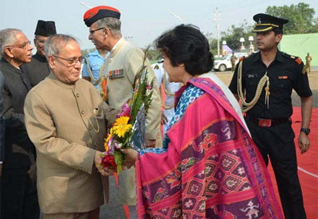 [Mrs. Sabiha Zameeruddin Shah presenting the bouquette to President Pranab Mukherjeet at Murshidabad Centre on Februrary 20, 2014 who inaugurated the centre on the same day. (File Photo)]