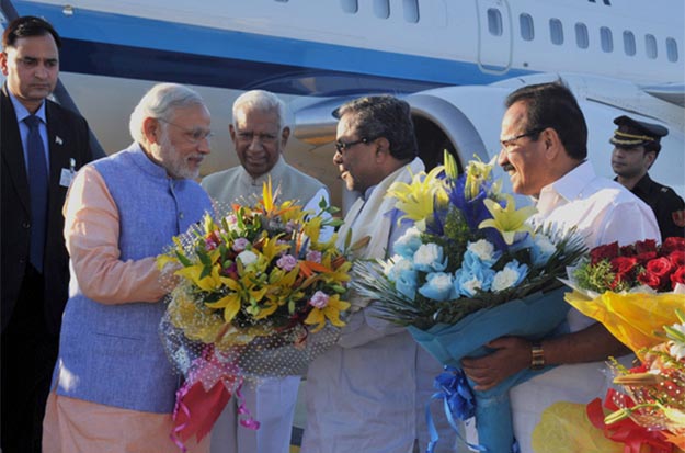 [Prime Minister Narendra Modi being welcomed by Governor of Karnataka Vajubhai Rudabhai Vala, Chief Minister of Karnataka, Siddaramaiah and Union Minister for Law & Justice D.V. Sadananda Gowda on his arrival, at Mysuru, Karnataka on January 02, 2016.]