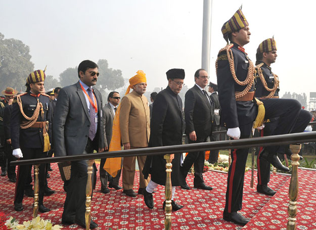 The celebrations began with Prime Minister Narendra Modi - dressed in a brown bandgalla suit and sporting a saffron Gujarati turban - driving to the Amar Jawan Jyoti memorial to the Unknown Soldier at India Gate and laying a wreath in honour of the countless Indian soldiers who have died in battles since World War I.