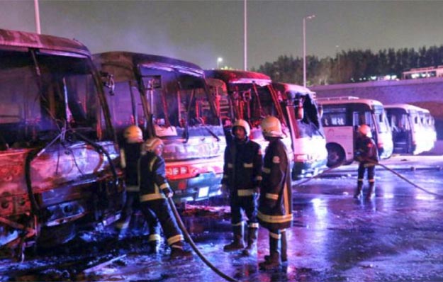 [Civil Defense personnel extinguishing the fire after seven buses were torched by a mob of protesting workers outside the Saudi Binladin Group's residential quarters in Makkah on Saturday night. (Okaz photo)]